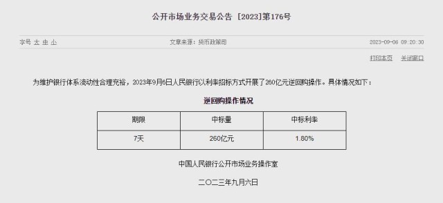 央視網(wǎng)消息:據(jù)央行網(wǎng)站消息,2023年9月6日人民銀行以利率招標方式開展了260億元逆回購操作。