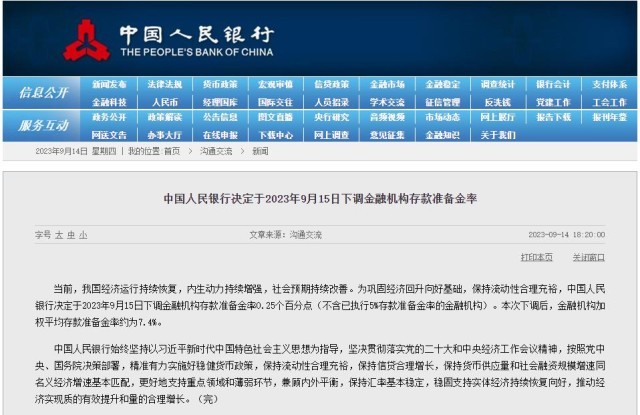 央行決定9月15日下調(diào)金融機(jī)構(gòu)存款準(zhǔn)備金率0.25個百分點(diǎn)