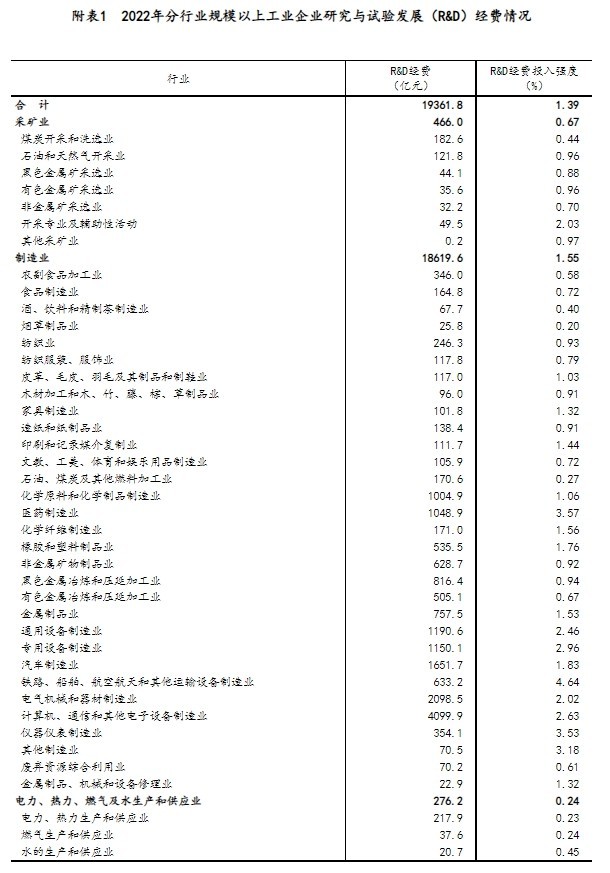 分產業(yè)部門看,高技術制造業(yè)研究與試驗發(fā)展(R&D)經費6507.7億元,投入強度(與營業(yè)收入之比)為2.91%,比上年提高0.20個百分點。在規(guī)模以上工業(yè)企業(yè)中,研究與試驗發(fā)展(R&D)經費投入超過千億元的行業(yè)大類有7個,比上年增加2個,這7個行業(yè)的經費占全部規(guī)模以上工業(yè)企業(yè)研究與試驗發(fā)展(R&D)經費的比重為63.2%(詳見附表1)。