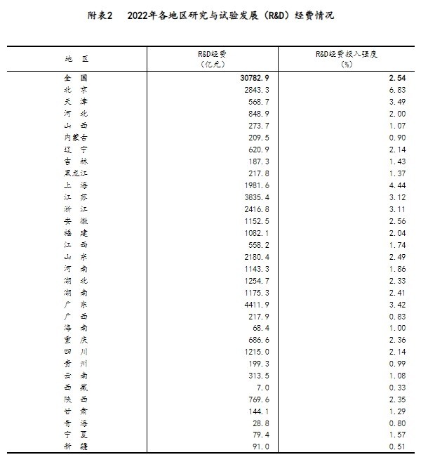 2022年,全國共投入研究與試驗發(fā)展(R&D)經費30782.9億元,比上年增加2826.6億元,增長10.1%;研究與試驗發(fā)展(R&D)經費投入強度(與國內生產總值[2]之比)為2.54%,比上年提高0.11個百分點[3]。按研究與試驗發(fā)展(R&D)人員全時工作量計算的人均經費為48.4萬元,比上年下降0.5萬元。