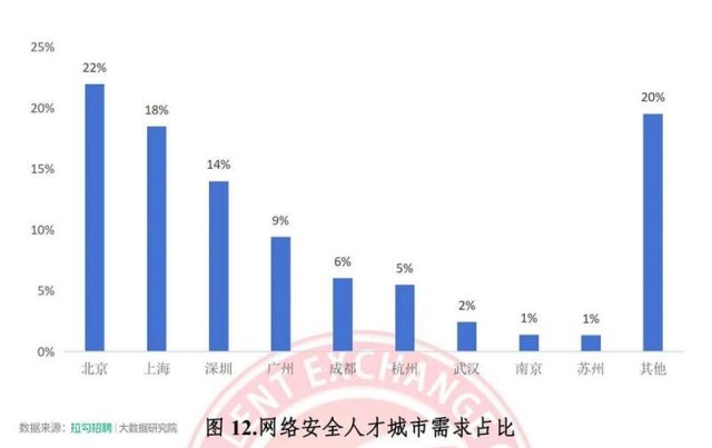 根據國家智慧教育公共服務平臺數據,2023年網絡安全相關本科專業(yè)(信息安全、網絡空間安全、網絡安全與執(zhí)法)畢業(yè)生規(guī)模約為 1.45 萬人??傮w上,網絡安全產業(yè)人才供需關系為供不應求。《報告》稱,根據拉勾招聘平臺數據顯示,最新網絡安全人才需求排名前六的城市分別是北京、上海、深圳、廣州、成都和杭州,占據市場總需求的75%左右。