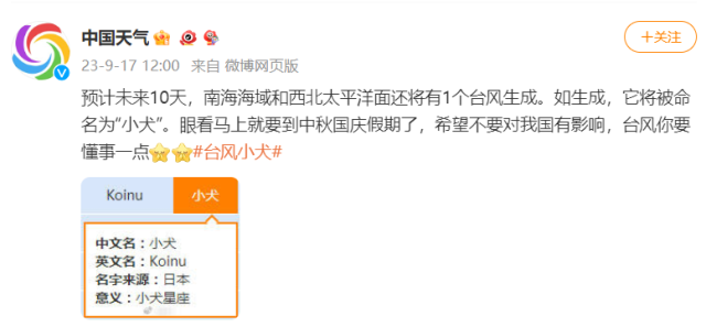 央視網(wǎng)消息:據(jù)@中國天氣 微博消息,預(yù)計(jì)未來10天,南海海域和西北太平洋面還將有1個(gè)臺(tái)風(fēng)生成。如生成,它將被命名為“小犬”。