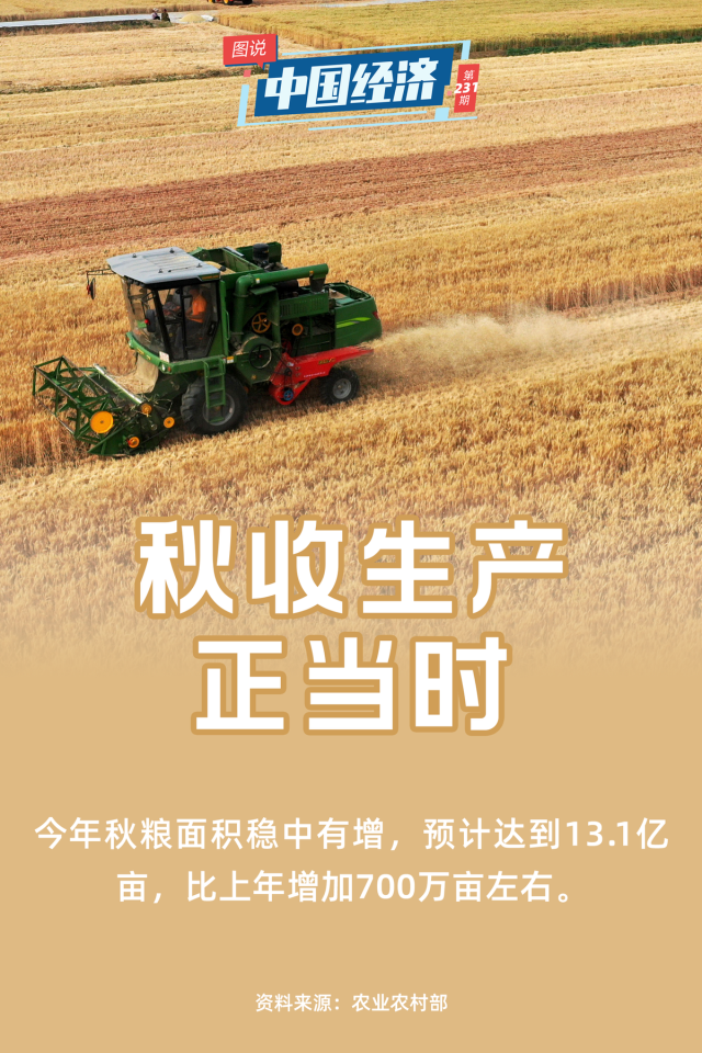 目前,我國早稻和夏糧均獲豐收,秋糧面積預計13.1億畝,比去年穩(wěn)中有增,豐收有基礎有希望。為保障今年秋收生產(chǎn),我國繼續(xù)從守護耕地、推進大中型灌區(qū)建設、保障農民種糧有錢賺不吃虧等方面入手,保障糧食安全,端牢中國飯碗。