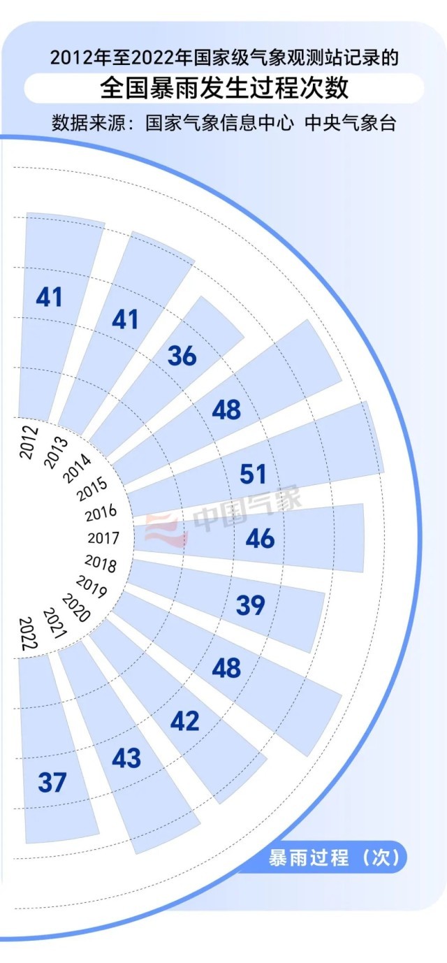我們通過數(shù)據(jù)了解下我國(guó)近年來(lái)的暴雨發(fā)生頻次。2012年至2022年間,我國(guó)共發(fā)生暴雨天氣過程472次,年均發(fā)生次數(shù)約為42.9次;2016年暴雨發(fā)生次數(shù)最多,為51次;2014年最少,為36次(2023年未結(jié)束,暫不計(jì))。