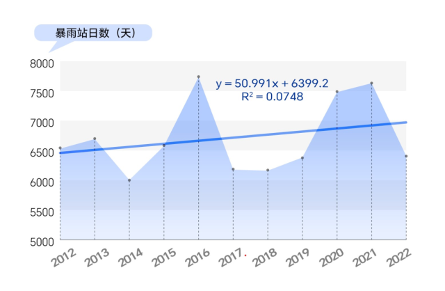 數(shù)據(jù)統(tǒng)計(jì)顯示,2012年至2022年,我國(guó)暴雨站日數(shù)有明顯的增加趨勢(shì)。這意味著,2012年到2022年,我國(guó)暴雨天氣過程的持續(xù)時(shí)間或影響范圍有增加(擴(kuò)大)的趨勢(shì)。