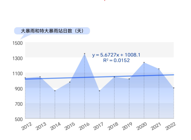 通過對(duì)大暴雨和特大暴雨站日數(shù)的統(tǒng)計(jì),我們發(fā)現(xiàn),2012年至2022年,我國(guó)大暴雨和特大暴雨的發(fā)生日數(shù)總體有緩慢增加的趨勢(shì),即我國(guó)大暴雨天氣過程的持續(xù)時(shí)間或影響范圍總體有緩慢增加(擴(kuò)大)的趨勢(shì)。