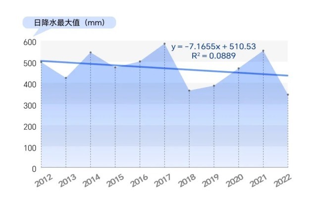 2012年至2022年國(guó)家級(jí)氣象觀測(cè)站記錄的最大單日降水量變化趨勢(shì)(單位:毫米)