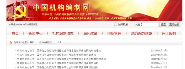 中國機構編制網12日消息,中共中央辦公廳、國務院辦公廳日前發(fā)布相關通知,調整工業(yè)和信息化部、生態(tài)環(huán)境部、國家衛(wèi)生健康委員會、中國人民銀行職責機構編制,調整中國社會科學院職責等事項。