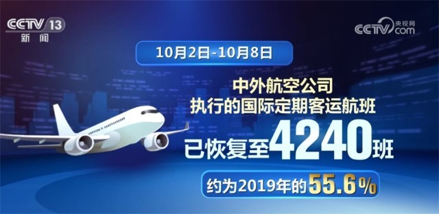 民航局最新數(shù)據(jù)顯示,上周(10月2日—10月8日),中外航空公司執(zhí)行的國際定期客運航班已恢復(fù)至4240班,約為2019年的55.6%;其中中方公司執(zhí)行2729班,占比64.4%,恢復(fù)至2019年的約57.5%;外航執(zhí)行1511班,占比35.6%,恢復(fù)至2019年的約42.5%。