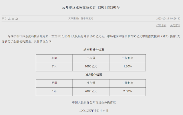 為維護(hù)銀行體系流動(dòng)性合理充裕,10月16日中國人民銀行開展1060億元公開市場(chǎng)逆回購操作和7890億元中期借貸便利(MLF)操作,充分滿足了金融機(jī)構(gòu)需求。