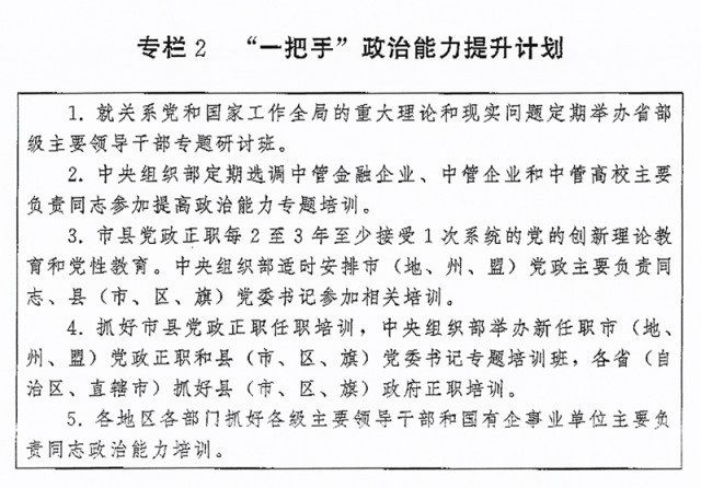 (二)突出“關(guān)鍵少數(shù)”政治訓(xùn)練。堅(jiān)持把政治訓(xùn)練貫穿干部成長(zhǎng)全周期,使干部的政治素養(yǎng)、政治能力與擔(dān)負(fù)的領(lǐng)導(dǎo)職責(zé)相匹配。強(qiáng)化“一把手”政治培訓(xùn),有計(jì)劃地選調(diào)地方、部門(mén)、國(guó)有企事業(yè)單位主要負(fù)責(zé)同志到黨校(行政學(xué)院)、干部學(xué)院參加專(zhuān)題培訓(xùn)。實(shí)施“一把手”政治能力提升計(jì)劃(專(zhuān)欄2)。?。ㄗ灾螀^(qū)、直轄市)、市(地、州、盟)、縣(市、區(qū)、旗)黨政領(lǐng)導(dǎo)班子成員每2至3年到黨校(行政學(xué)院)、干部學(xué)院至少接受1次系統(tǒng)的黨的創(chuàng)新理論教育和黨性教育,5年內(nèi)累計(jì)不少于2個(gè)月。圍繞提高政治能力和領(lǐng)導(dǎo)能力,加強(qiáng)機(jī)關(guān)司局長(zhǎng)、處長(zhǎng)任職培訓(xùn)。重視對(duì)女干部、少數(shù)民族干部、黨外干部等的政治培訓(xùn)。加強(qiáng)對(duì)高層次人才的政治引領(lǐng),中央組織部會(huì)同有關(guān)單位每年組織一定數(shù)量人才開(kāi)展國(guó)情研修。