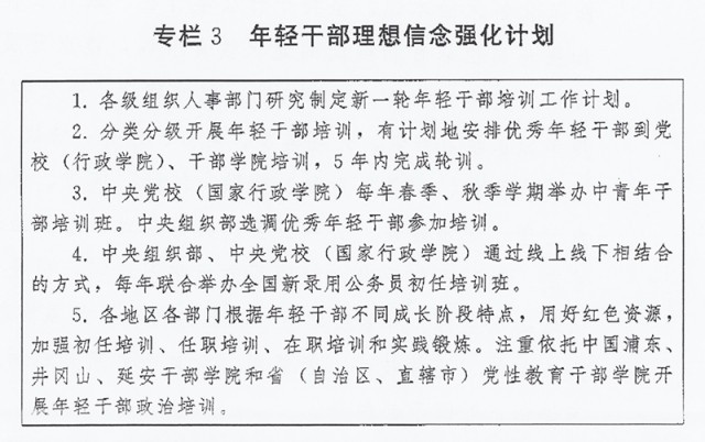 ?。ㄈ┘訌?qiáng)年輕干部政治訓(xùn)練。強(qiáng)化習(xí)近平新時(shí)代中國(guó)特色社會(huì)主義思想學(xué)習(xí)教育,突出政治忠誠(chéng)教育、理想信念教育、紀(jì)律規(guī)矩教育,加強(qiáng)優(yōu)良傳統(tǒng)作風(fēng)和責(zé)任感使命感教育,強(qiáng)化斗爭(zhēng)意識(shí),綜合運(yùn)用理論講授、政策解讀、案例教學(xué)、現(xiàn)場(chǎng)體驗(yàn)等方式開(kāi)展系統(tǒng)培訓(xùn)。黨委(黨組)負(fù)責(zé)同志要講好“開(kāi)班第一課”。安排思想政治素質(zhì)過(guò)硬、理論水平較高、實(shí)踐經(jīng)驗(yàn)豐富的領(lǐng)導(dǎo)干部上講臺(tái)授課。探索推行“政治輔導(dǎo)員”、“導(dǎo)師幫帶”制度。通過(guò)開(kāi)展黨性分析、實(shí)踐鍛煉、過(guò)“政治生日”、重溫入黨誓詞等方式,錘煉黨性修養(yǎng)、提高政治覺(jué)悟。實(shí)施年輕干部理想信念強(qiáng)化計(jì)劃(專(zhuān)欄3)。