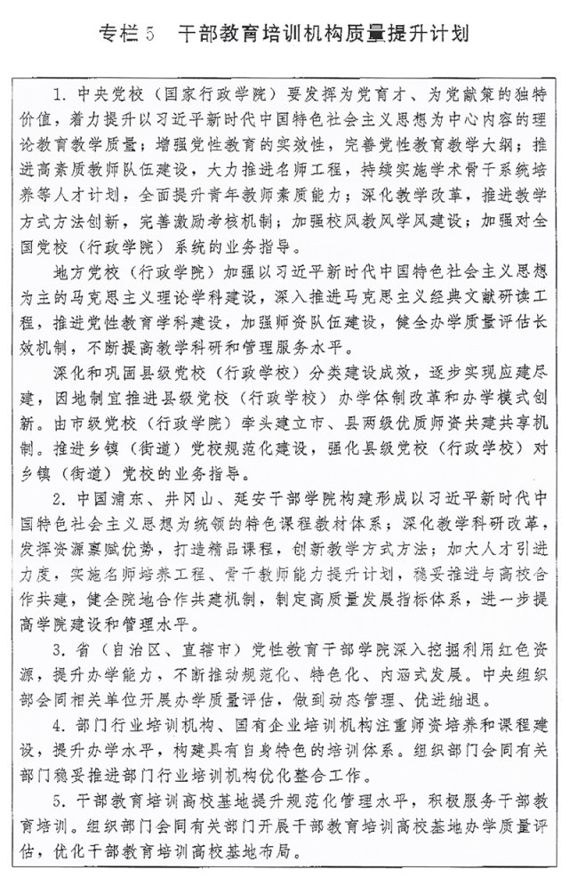 ?。ㄒ唬┡嘤?xùn)機(jī)構(gòu)建設(shè)。推進(jìn)各級(jí)黨校(行政學(xué)院)建設(shè),以教學(xué)督導(dǎo)、師資培養(yǎng)、質(zhì)量評(píng)估為重點(diǎn),強(qiáng)化上級(jí)黨校(行政學(xué)院)對(duì)下級(jí)黨校(行政學(xué)院)的業(yè)務(wù)指導(dǎo),不斷提高辦學(xué)水平。推進(jìn)縣級(jí)黨校(行政學(xué)校)分類(lèi)建設(shè)。加強(qiáng)社會(huì)主義學(xué)院建設(shè)。進(jìn)一步提升部門(mén)行業(yè)培訓(xùn)機(jī)構(gòu)、國(guó)有企業(yè)培訓(xùn)機(jī)構(gòu)辦學(xué)質(zhì)量。加強(qiáng)對(duì)干部教育培訓(xùn)高?;亍⒒鶎痈刹拷逃嘤?xùn)機(jī)構(gòu)辦學(xué)指導(dǎo)。開(kāi)展黨校(行政學(xué)院)、?。ㄗ灾螀^(qū)、直轄市)黨性教育干部學(xué)院、干部教育培訓(xùn)高?;剞k學(xué)質(zhì)量評(píng)估。加強(qiáng)各類(lèi)黨員干部教育培訓(xùn)機(jī)構(gòu)規(guī)范管理,嚴(yán)控新設(shè)以黨員干部為培訓(xùn)對(duì)象的培訓(xùn)機(jī)構(gòu)。支持地方、部門(mén)聯(lián)合開(kāi)展培訓(xùn),鼓勵(lì)干部教育培訓(xùn)機(jī)構(gòu)開(kāi)展區(qū)域協(xié)作交流,推動(dòng)優(yōu)質(zhì)培訓(xùn)資源共享。實(shí)施干部教育培訓(xùn)機(jī)構(gòu)質(zhì)量提升計(jì)劃(專(zhuān)欄5)。