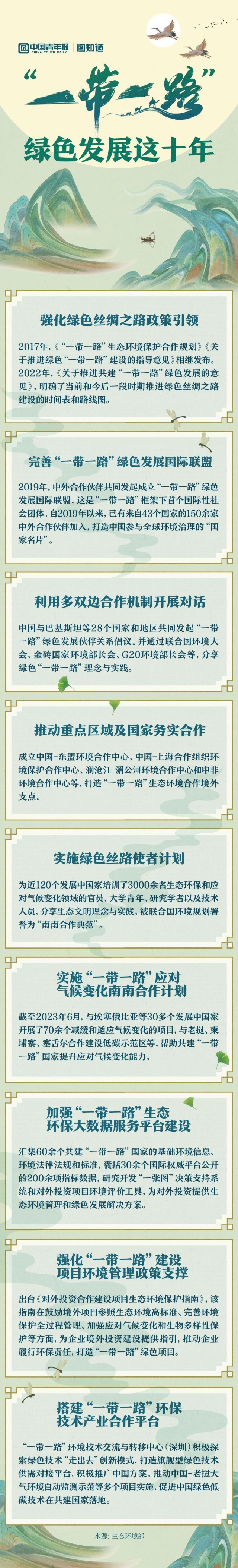 綠色已成為共建“一帶一路”鮮明底色。十年來,綠色絲綢之路建設為全球環(huán)境與氣候治理不斷貢獻力量。中國實施的綠色絲路使者計劃為近120個發(fā)展中國家培訓了3000余名生態(tài)環(huán)保和應對氣候變化領域的大學青年、技術(shù)人員等,許多年輕人成為綠色絲路使者,為共建“一帶一路”國家落實聯(lián)合國2030年可持續(xù)發(fā)展議程提供方案,接力下一個十年。