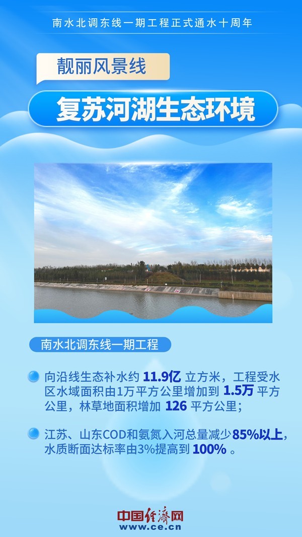 10年來,東線一期工程為解決受水區(qū)水生態(tài)、水環(huán)境長期性累積性問題提供了重要的替代水源,向沿線生態(tài)補水約11.9億立方米,工程受水區(qū)的水域面積由1萬平方公里增加到1.5萬平方公里,面積占比由6%增加到8%,水庫坑塘面積增加明顯,林草地面積增加了126平方公里。