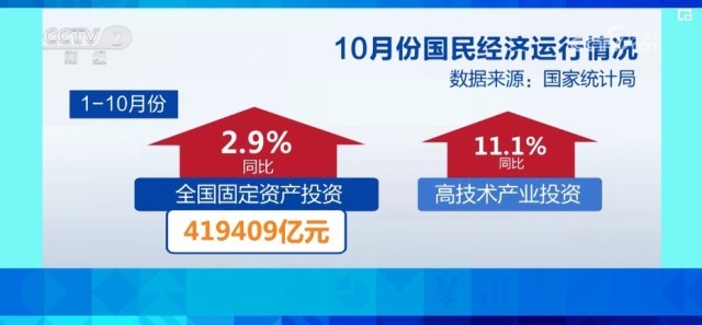 從投資來看,固定資產(chǎn)投資規(guī)模繼續(xù)擴大。1—10月份,全國固定資產(chǎn)投資419409億元,同比增長2.9%。其中,高技術(shù)產(chǎn)業(yè)投資同比增長11.1%,增長較快。