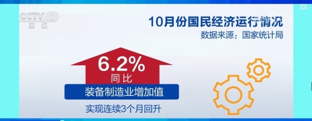 10月份,全國規(guī)模以上工業(yè)增加值比上月加快0.1個百分點。其中,裝備制造業(yè)增加值同比增長6.2%,比上月加快0.7個百分點,連續(xù)3個月回升。