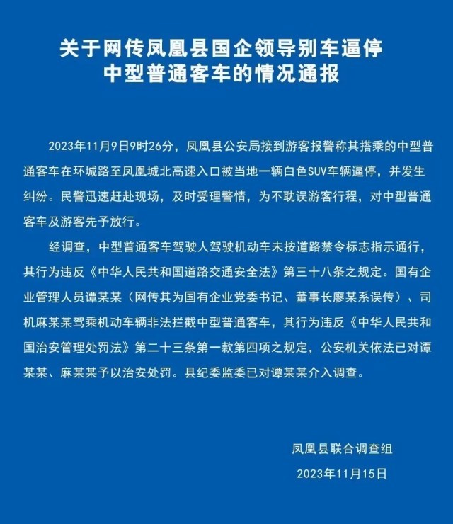 央視網(wǎng)消息:據(jù)鳳凰融媒微信公眾號消息,11月15日,鳳凰縣聯(lián)合調(diào)查組發(fā)布情況通報,經(jīng)調(diào)查,中型普通客車駕駛?cè)笋{駛機動車未按道路禁令標志指示通行,其行為違反相關(guān)規(guī)定。國有企業(yè)管理人員譚某某 (網(wǎng)傳其為國有企業(yè)黨委書記、董事長廖某系誤傳)、司機麻某某駕乘機動車輛非法攔截中型普通客車,其行為違反相關(guān)規(guī)定,公安機關(guān)依法已對譚某某、麻某某予以治安處罰??h紀委監(jiān)委已對譚某某介入調(diào)查。