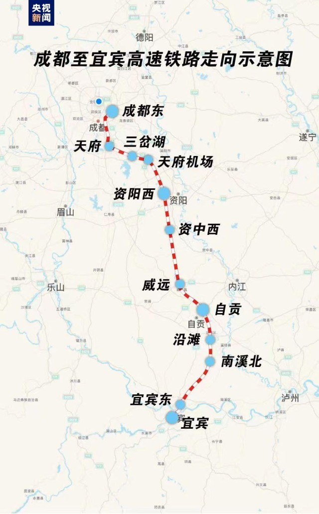 成都至宜賓高速鐵路由新建成都東至宜賓東高速鐵路(以下簡稱“成宜高鐵”)和新建重慶至昆明高速鐵路宜賓東至宜賓(以下簡稱“渝昆高鐵宜賓段”)組成。線路北起成宜高鐵成都東站,止于渝昆高鐵宜賓站。成都至宜賓高速鐵路為雙線高速鐵路,全線共設(shè)成都東、天府、三岔湖、天府機(jī)場、資陽西、資中西、威遠(yuǎn)、自貢、沿灘、南溪北、宜賓東、宜賓等12個車站,其中成都東和自貢站為既有站,天府站為緩開站。