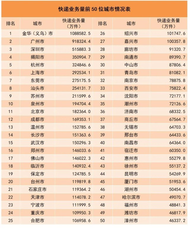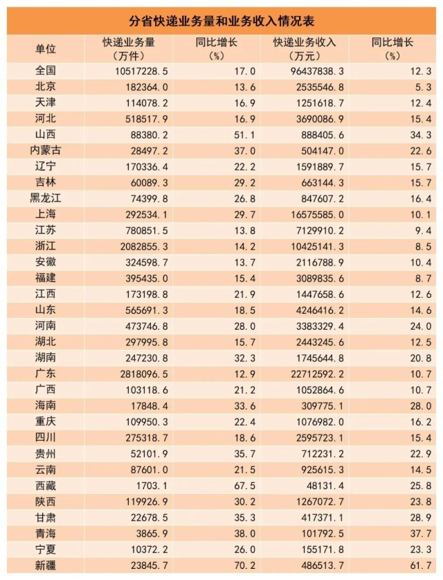 1-10月,同城快遞業(yè)務(wù)量累計(jì)完成108.3億件,同比增長(zhǎng)2.7%;異地快遞業(yè)務(wù)量累計(jì)完成919.2億件,同比增長(zhǎng)18.2%;國(guó)際/港澳臺(tái)快遞業(yè)務(wù)量累計(jì)完成24.2億件,同比增長(zhǎng)55.1%。