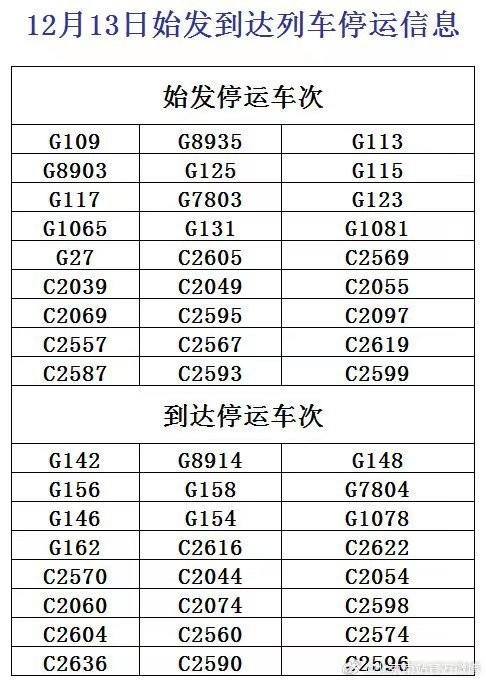 據(jù)北京西站官方微博今天中午最新消息,受降雪影響,12月13日,北京西站G57、G807、G97次列車臨時(shí)停運(yùn),北京豐臺(tái)站G63、G629次列車臨時(shí)停運(yùn)。今天早上,北京西站、北京豐臺(tái)站已發(fā)布部分停運(yùn)列車信息。已購買停運(yùn)列車車票的旅客,可于30日內(nèi)辦理全額退票手續(xù)。請廣大旅客合理安排出行,關(guān)注車站公告或12306網(wǎng)站信息。