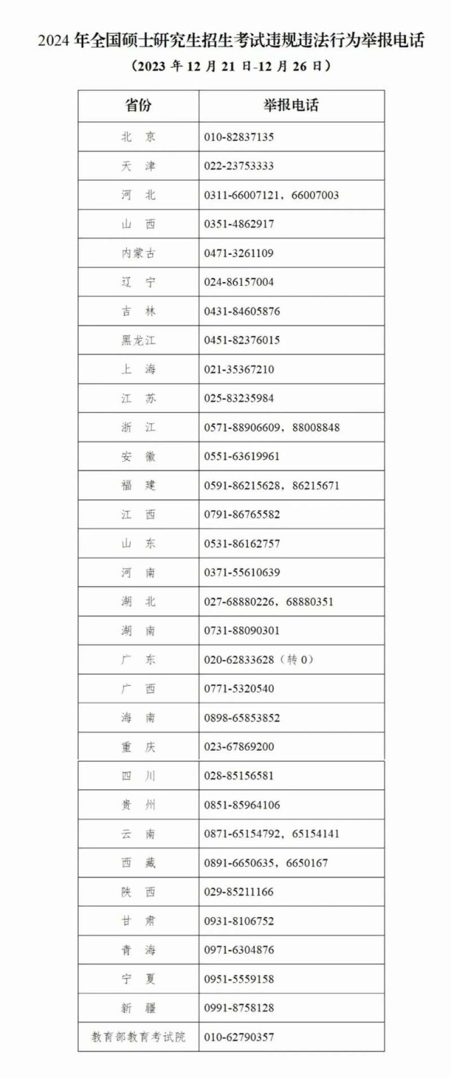 教育部和各省(區(qū)、市)教育招生考試機(jī)構(gòu)將開通2024年研考舉報(bào)電話,考生及社會(huì)各界人士可及時(shí)舉報(bào)反映有關(guān)問題線索。教育部及各?。▍^(qū)、市)將會(huì)同有關(guān)部門根據(jù)舉報(bào)線索第一時(shí)間核查處理,堅(jiān)決維護(hù)風(fēng)清氣正的研考環(huán)境。
