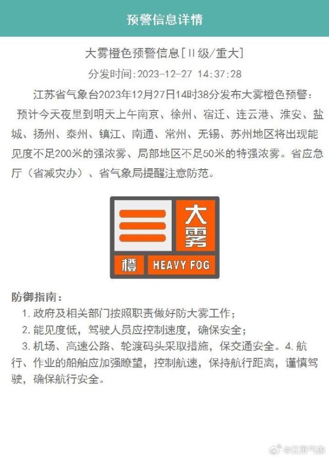 央視網(wǎng)消息:據(jù)@江蘇氣象 微博消息,江蘇省氣象臺2023年12月27日14時38分發(fā)布大霧橙色預(yù)警: 預(yù)計今天夜里到明天上午南京、徐州、宿遷、連云港、淮安、鹽城、揚州、泰州、鎮(zhèn)江、南通、常州、無錫、蘇州地區(qū)將出現(xiàn)能見度不足200米的強(qiáng)濃霧、局部地區(qū)不足50米的特強(qiáng)濃霧。江蘇省應(yīng)急廳(省減災(zāi)辦)、省氣象局提醒注意防范。
