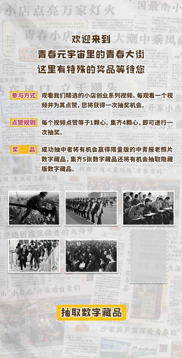 奔跑在青春大街上的青小豹邀請(qǐng)讀者一起玩尋找小店的游戲,大家可以邊體驗(yàn)邊觀看一個(gè)個(gè)小店和店主的故事,參加愛心點(diǎn)贊,還可以參與抽獎(jiǎng)。獎(jiǎng)品是用區(qū)塊鏈技術(shù)創(chuàng)制的數(shù)字藏品——改革開放45年以來中國(guó)青年報(bào)拍攝的精彩照片。