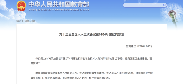 早在2021年,教育部官網(wǎng)曾公布《對(duì)十三屆全國人大三次會(huì)議第9284號(hào)建議的答復(fù)》,下一步,教育部將進(jìn)一步加強(qiáng)面向全體醫(yī)學(xué)類專業(yè)學(xué)生開展老年醫(yī)學(xué)教育,同時(shí),協(xié)同國家衛(wèi)生健康委,鼓勵(lì)高校加強(qiáng)老年醫(yī)學(xué)學(xué)科建設(shè)、推進(jìn)老年醫(yī)學(xué)??漆t(yī)師規(guī)范化培訓(xùn)。