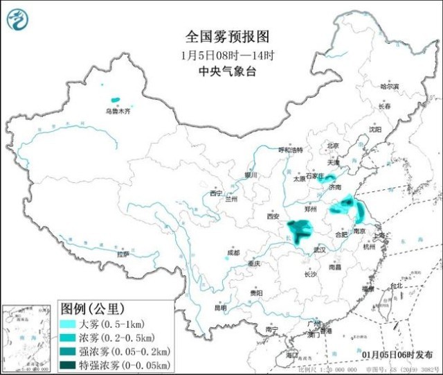 預計,5日早晨至上午,河北南部、山東西北部、江蘇中北部、安徽北部、河南南部、湖北北部等地的部分地區(qū)有大霧,其中江蘇中北部、河南南部、湖北北部等地的部分地區(qū)有能見度低于200米的強濃霧,局地有能見度低于低于50米的特強濃霧。
