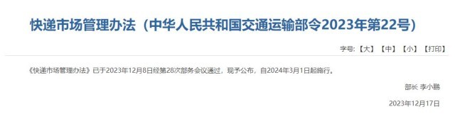 央視網消息:《快遞市場管理辦法》已于2023年12月8日經第28次部務會議通過,現予公布,自2024年3月1日起施行。