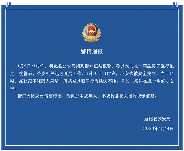 央視網(wǎng)消息:據(jù)“新化公安”公眾號消息,湖南新化縣公安局1月14日晚發(fā)布警情通報,1月9日21時許,新化縣公安局接到群眾伍某報警,稱其女兒被一陌生男子強行抱走。接警后,公安機關(guān)迅速開展工作。1月10日11時許,小女孩被安全找到;當(dāng)日14時,抓獲犯罪嫌疑人周某,周某對其犯罪行為供認不諱。目前,案件在進一步偵辦之中。