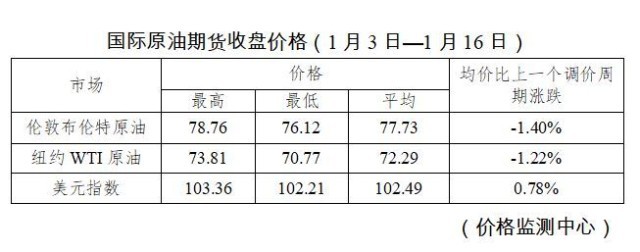 據(jù)國家發(fā)展改革委價(jià)格監(jiān)測(cè)中心監(jiān)測(cè),本輪成品油調(diào)價(jià)周期內(nèi)(1月3日-1月16日)國際油價(jià)在震蕩中小幅下降。平均來看,倫敦布倫特、紐約WTI油價(jià)比上輪調(diào)價(jià)周期下跌1.31%。