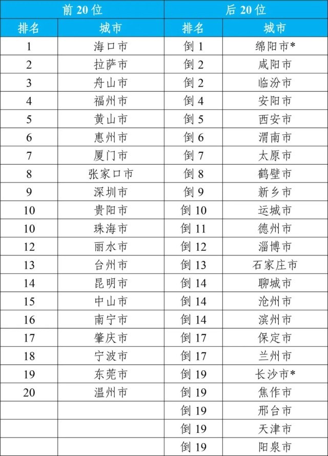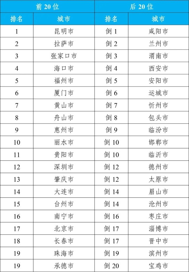12月,168個(gè)重點(diǎn)城市中:空氣質(zhì)量排名前20位城市依次是昆明、拉薩和張家口等城市(從第1名至并列第19名);空氣質(zhì)量排名后20位城市依次是咸陽、蘭州和渭南等城市(從倒數(shù)第1名至倒數(shù)第20名)。見附表1。