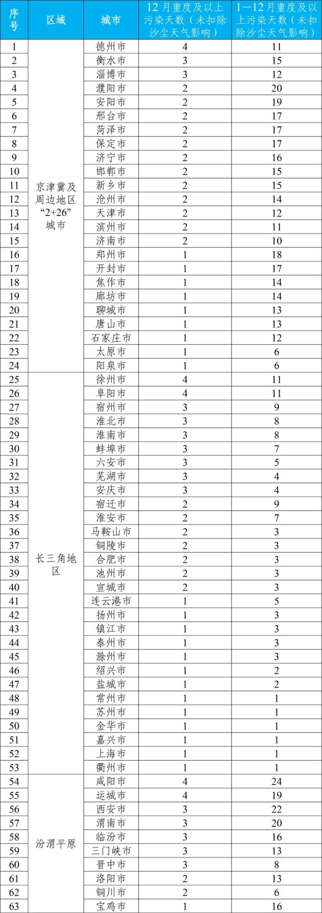 12月和1—12月重點(diǎn)區(qū)域出現(xiàn)重度及以上污染天的城市及具體天數(shù)詳見附表4。