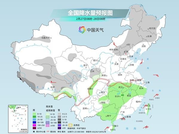 氣象部門提醒,南方大部陰雨頻繁的天氣將延續(xù)至3月初,其中,后天至3月1日,降水又將增強(qiáng),需關(guān)注路面濕滑、能見(jiàn)度下降等對(duì)春運(yùn)出行等方面的不利影響。華北、東北部分地區(qū)今明天將有降雪,公眾雪天外出請(qǐng)留意交通安全。