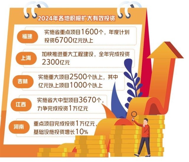 各地2024年政府工作報(bào)告中對今年如何擴(kuò)大有效投資進(jìn)行了系統(tǒng)部署,不少地方還公布了具體金額。比如,福建將謀劃實(shí)施省重點(diǎn)項(xiàng)目1600個、年度計(jì)劃投資6700億元以上;上海今年將加快推進(jìn)重大工程建設(shè),全年完成投資2300億元;吉林今年計(jì)劃實(shí)施重大項(xiàng)目2500個以上,其中億元以上項(xiàng)目1000個以上;江西今年實(shí)施省大中型項(xiàng)目3670個,力爭完成投資1萬億元;河南重點(diǎn)項(xiàng)目完成投資1萬億元,基礎(chǔ)設(shè)施投資增長10%;安徽開展先進(jìn)制造業(yè)投資“領(lǐng)跑”計(jì)劃,制造業(yè)投資增長10%以上。