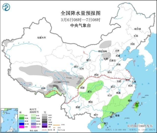 3月6日08時至7日08時,西藏東部和南部、青海南部、川西高原北部、山西北部等地部分地區(qū)有小雪或雨夾雪,其中,西藏東部、川西高原北部等地部分地區(qū)有中到大雪。江南東部和南部、西南地區(qū)東部、華南中東部、臺灣島等地部分地區(qū)有小雨,其中,臺灣島北部等地部分地區(qū)有中雨。內(nèi)蒙古西北部部分地區(qū)有4~5級風(fēng)(見圖1)。