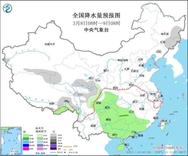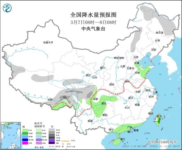 圖1 全國降水量預(yù)報圖(3月6日08時-7日08時)