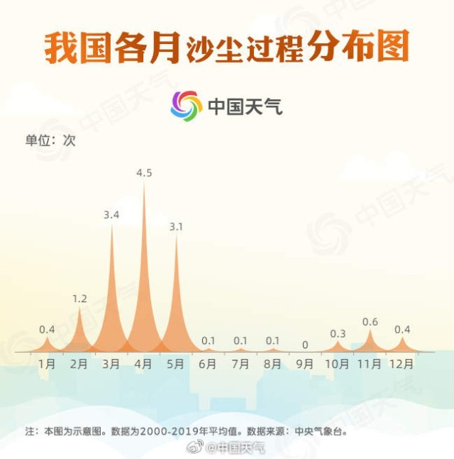 常年統(tǒng)計(jì)來看,我國沙塵天氣過程在一年中一般首次出現(xiàn)在2月,3-5月進(jìn)入高發(fā)期。從我國2000-2019年各月沙塵天氣過程的分布情況來看,3-5月的沙塵過程能占到全年的80%,4月份沙塵天氣最為頻繁,常年平均達(dá)到4.5次,3月和5月不相上下,分別為3.4次和3.1次。