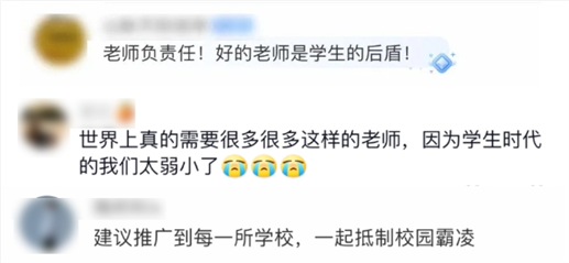 這位老師的做法,贏(yíng)得了眾多網(wǎng)友的點(diǎn)贊:“好老師是學(xué)生的后盾”“一起抵制校園霸凌”。