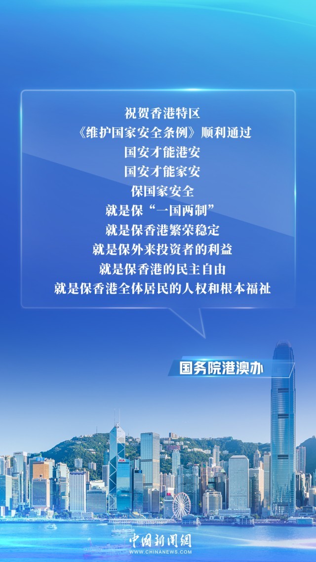 國務院港澳辦強調,香港國安條例順利通過,為保持香港長期繁榮穩(wěn)定、推動“一國兩制”實踐行穩(wěn)致遠提供更加堅實的制度保障。香港國安條例全面有效維護國家安全,充分尊重和保障人權,更好統(tǒng)籌發(fā)展和安全。