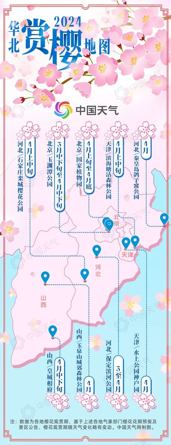 中國天氣網(wǎng)訊 “層層圍珠璣,團(tuán)團(tuán)錦繡簇?!卑殡S著春天的腳步,華北地區(qū)又迎來一年中最美的賞櫻季。春日盛景不可負(fù),錯(cuò)過一季就要再等一年!中國天氣網(wǎng)推出2024華北地區(qū)賞櫻地圖,賞櫻勝地花期一圖看盡,邀你共赴一場櫻花之約。