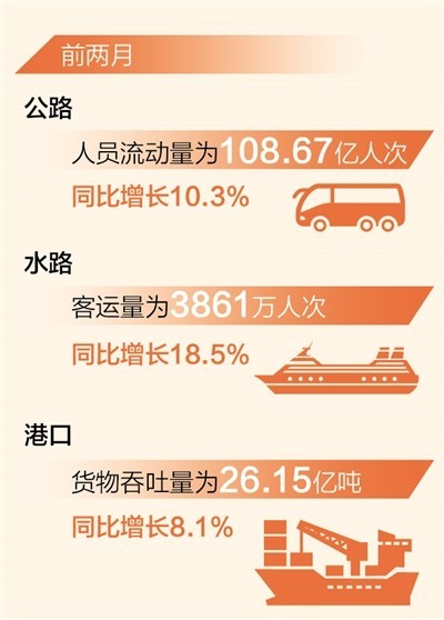 貨運(yùn)量穩(wěn)步增長(zhǎng)。前兩月,我國(guó)公路貨運(yùn)量達(dá)到54.54億噸,同比增長(zhǎng)7.8%;水路貨運(yùn)量近14億噸,同比增長(zhǎng)10.2%。