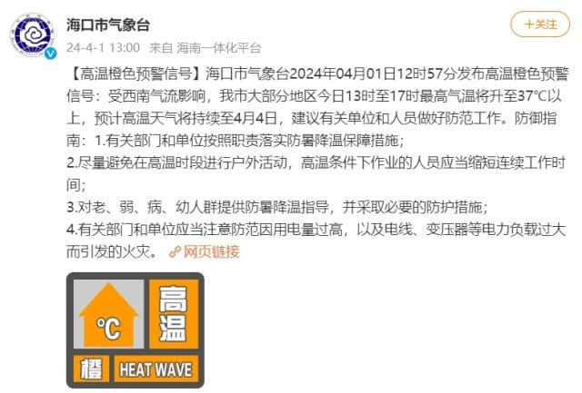 央視網(wǎng)消息:據(jù)@海口市氣象臺 微博消息,海口市氣象臺2024年04月01日12時(shí)57分發(fā)布高溫橙色預(yù)警信號:受西南氣流影響,??谑写蟛糠值貐^(qū)今日13時(shí)至17時(shí)最高氣溫將升至37℃以上,預(yù)計(jì)高溫天氣將持續(xù)至4月4日,建議有關(guān)單位和人員做好防范工作。