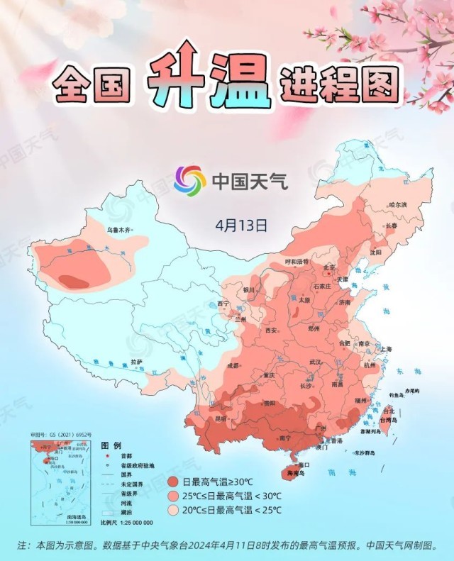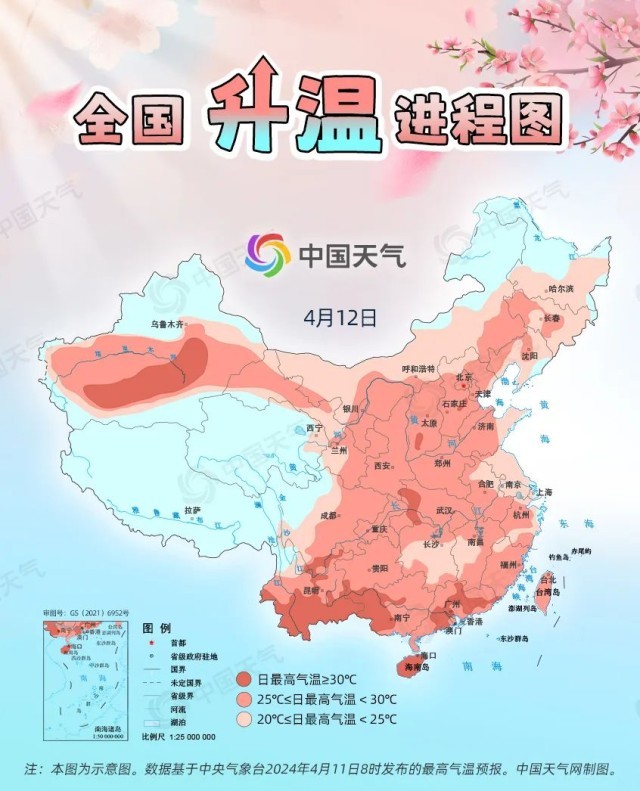 眼下,全國大部處于冷空氣影響間歇期,升溫是主旋律。預(yù)計(jì)今起三天(4月11日至13日),我國從北到南都將開啟回暖進(jìn)程,最高氣溫25℃以上的區(qū)域幾乎覆蓋整個(gè)中東部,波及20余省份,東北、西北地區(qū)氣溫將大面積創(chuàng)今年以來新高,北方不少地方還會體驗(yàn)到常年5月中旬才有的超前暖熱。中國天氣網(wǎng)推出全國升溫進(jìn)程圖,看看哪些地方將沖擊30℃。
