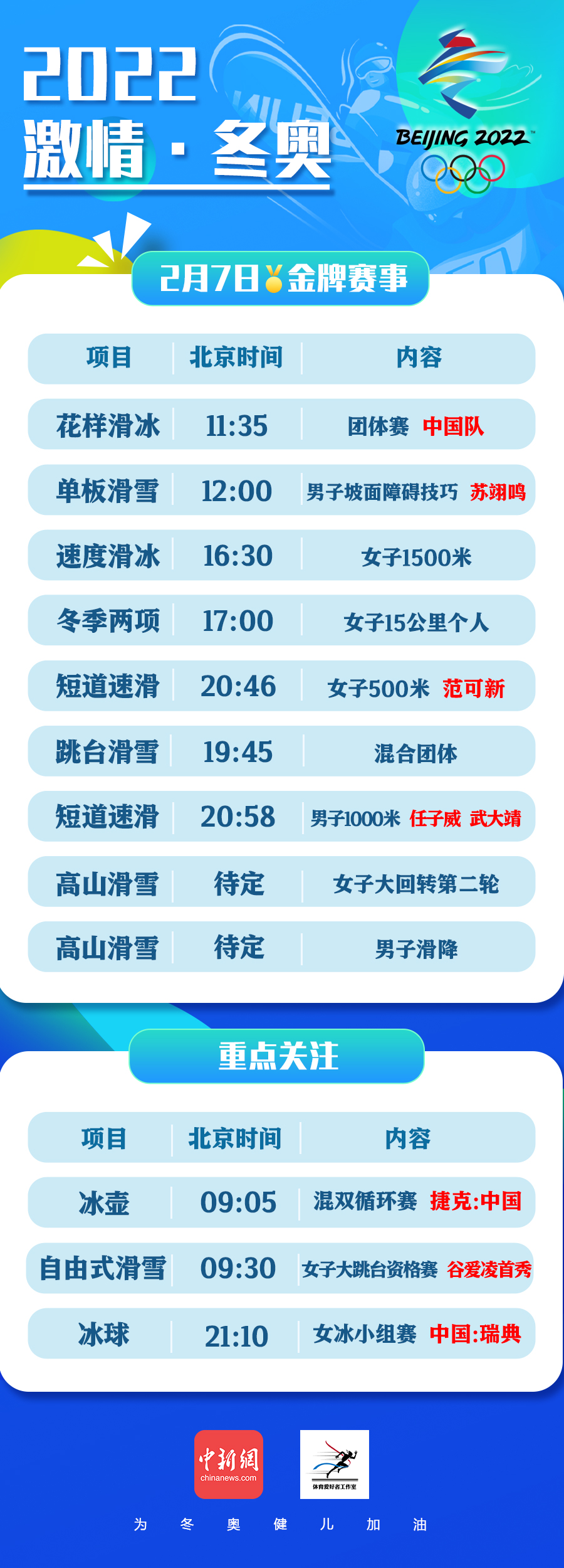 中新網(wǎng)2月7日電 蘇翊鳴爭冠、谷愛凌首秀、中國短道速滑再沖金、速度滑冰“冬奧獎牌王”有望擴大紀錄……7日的北京冬奧賽場,諸多看點值得期待。