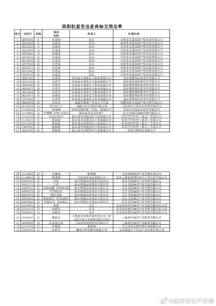 中新網2月14日電 國家知識產權局14日在其官方微博發(fā)布聲明稱,國家知識產權局對惡意搶注北京2022年冬奧會和冬殘奧會吉祥物、運動健兒姓名等行為予以堅決打擊,依據(jù)《奧林匹克標志保護條例》、《商標法》第十條第一款第(八)項等規(guī)定,對第41128524號“冰墩墩”、第62453532號“谷愛凌”等429件商標注冊申請予以駁回;依據(jù)《商標法》第四十四條第一款規(guī)定,對已注冊的第41126916號“雪墩墩”、第38770198號 “谷愛凌”等43件商標依職權主動宣告無效。