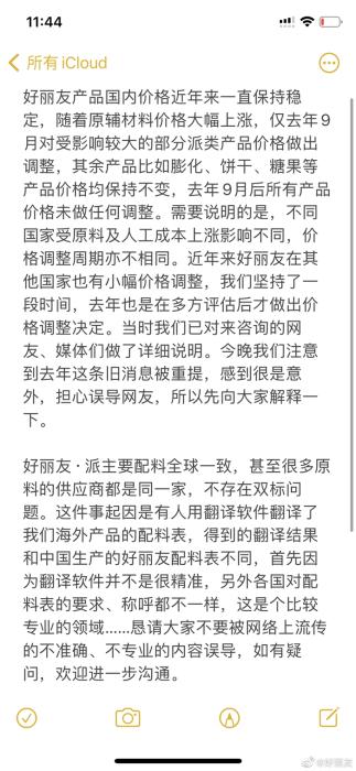 中新財經(jīng)3月2日電 近日,有網(wǎng)友爆料稱,好麗友僅對中國等市場實行漲價,以應(yīng)對原材料上漲。對此,好麗友官方微博回應(yīng)稱,好麗友產(chǎn)品國內(nèi)價格近年來一直保持穩(wěn)定,隨著原材料價格大幅上漲,僅去年9月對受影響較大的部分派類產(chǎn)品價格做出調(diào)整,其余產(chǎn)品比如膨化、餅干、糖果等產(chǎn)品價格均保持不變。且不同國家受原料及人工成本上漲影響不同,價格調(diào)整周期亦不相同。此外,針對配料“雙標(biāo)”爭議,好麗友表示,好麗友·派主要配料全球一致,爭議系翻譯軟件翻譯海外產(chǎn)品配料表時表述不準(zhǔn)導(dǎo)致。