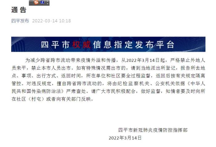 吉林四平:嚴(yán)格禁止外地人員來平,禁止本市人員出市